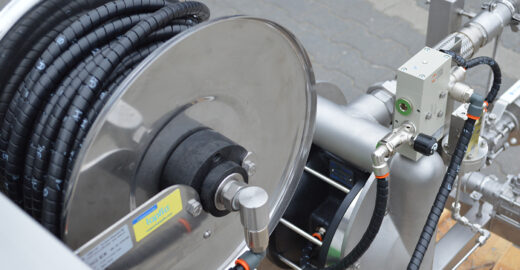 Metallmembranpumpe mit Guardian-System (Überwachung des Pumpenmembranausfalls), pneumatischer Schlauchtrommel und Erdungskabeltrommel, konfiguriert für einen Chemikalienhersteller.